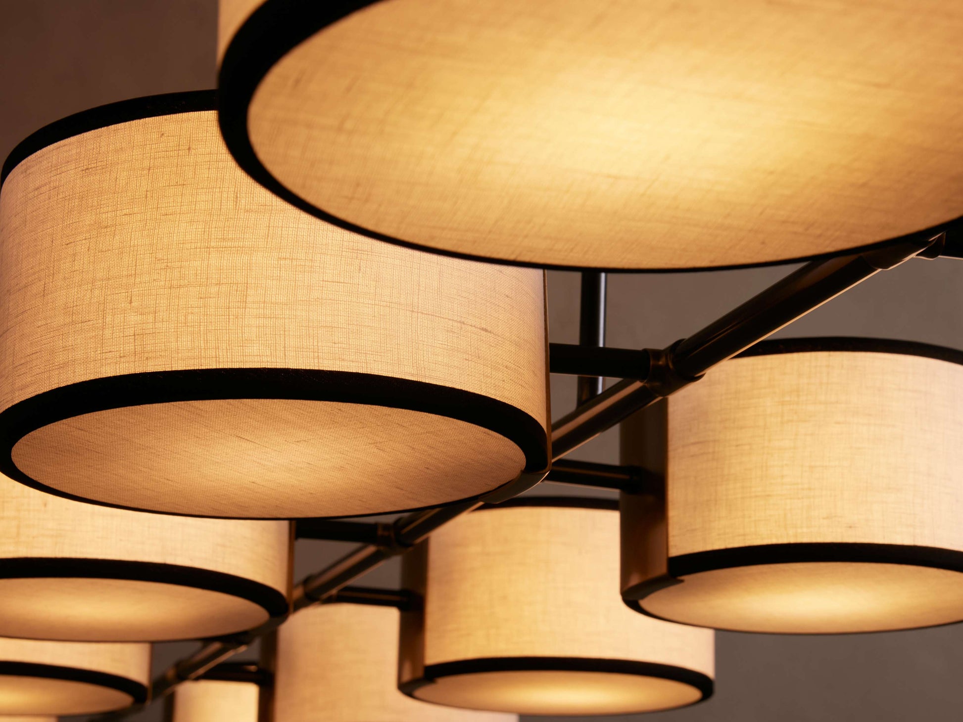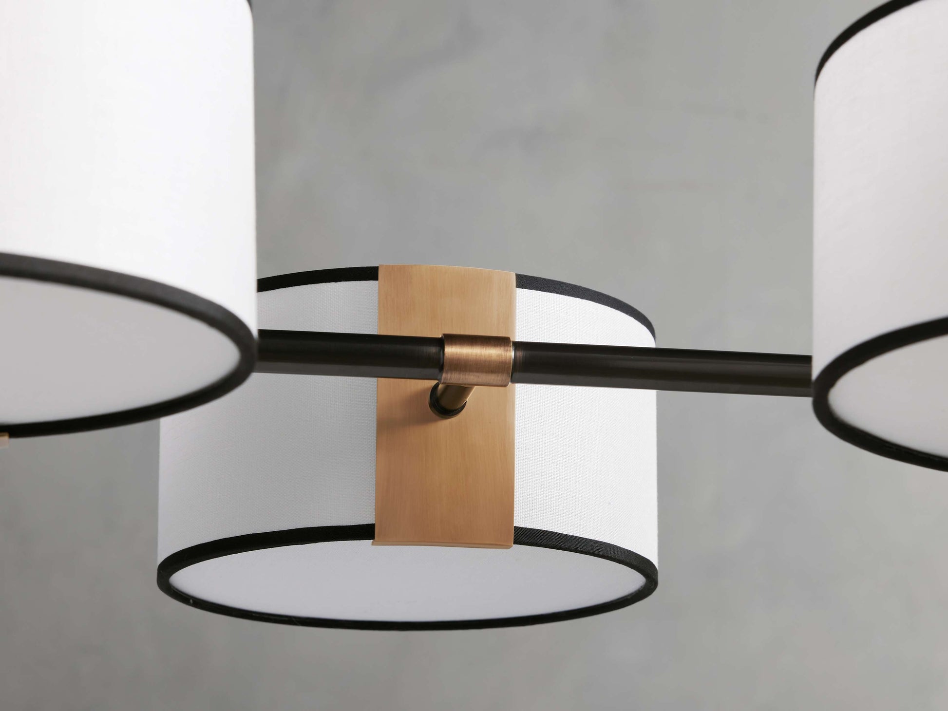 - Bronze fixtures include a white linen shade with black trim; light bronze fixtures include a cream parchment shade with brown trim.