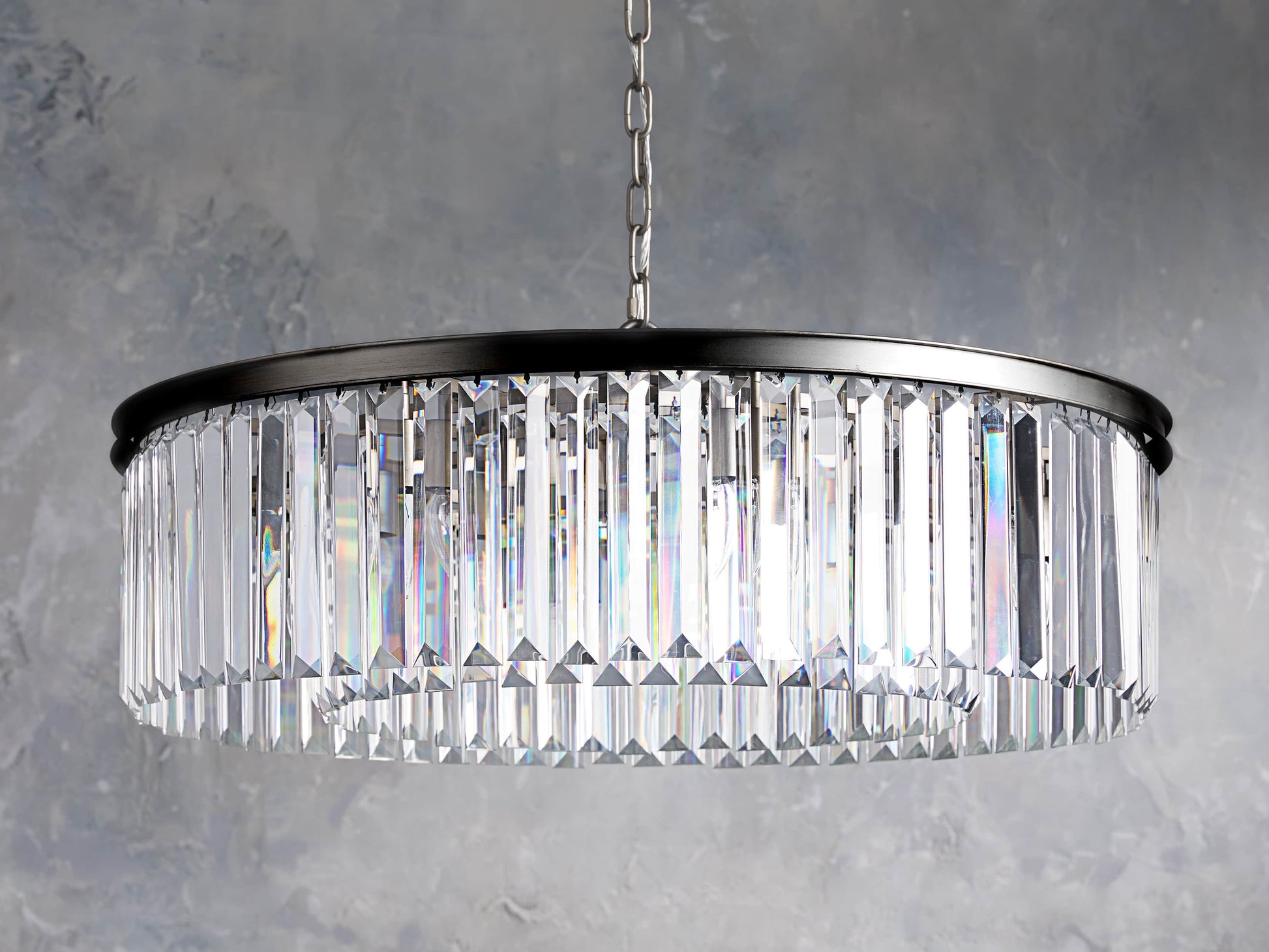 - Crafted from multifaceted K9 glass crystals with an iron frame and oil-rubbed finish.