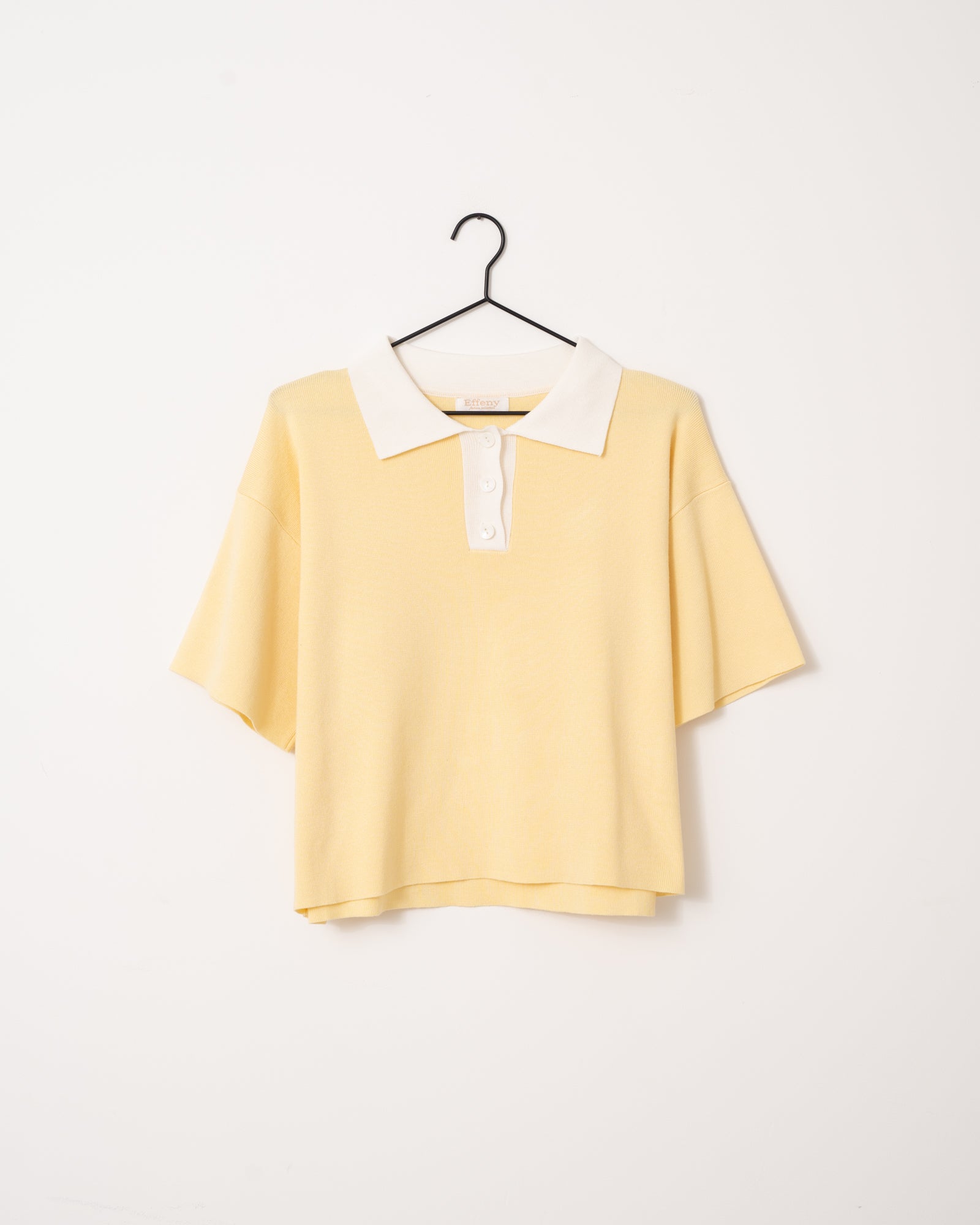 Zachte gele polo met een relaxte fit en opvallende witte kraag. Style met een witte jeans voor de iets koelere zomerdagen.